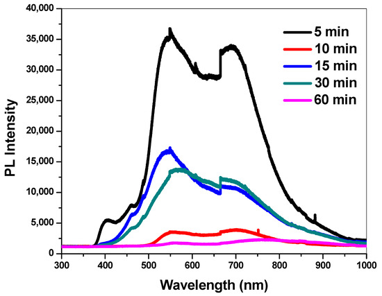 Studies on photoluminescence (PL) provide important insights into atomic structure and material quality. PL spectra for CdS thin films were captured at ambient conditions, as presented in Figure 12. For PL emission and absorption spectra, flaws such as vacancies or electron-hole recombination sites were clearly present [24]. The main peaks appeared at 537 nm (2.30 eV) and at about 710 nm (1.75 eV) at room temperature. These could be attributed to the transition from the valence band to the conduction band and excitonic transitions (for example, pairs recombination and emissions where excitonic transitions are due to the cadmium interstitials (Cd) or sulfur vacancies (S) defects existing in CdS thin films) [37]. The near-band edge (NBE) emission from free excitons recombining causes the emission peak for all deposited CdS thin films at around 2.3 eV [25]. The optical band gap values measured almost exactly match the CdS thin film’s emission peak position. Due to the Cd vacancies acting as acceptors (defects) or centers to capture carriers, which decrease as deposition time increases, photoluminescence declines as deposition time rises. Such defects decrease as the boundary between particles increases. The intensity decreases as deposition time increases, which suggests lesser carriers’ recombination as well as higher separation and collection of charge carriers. Results show that CdS thin films are appropriate candidates for solar cells.