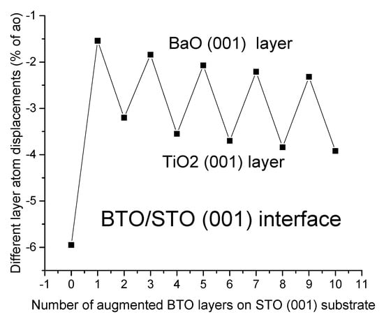 We carried out ab initio B3PW computations of the STO/BTO (001) heterostructures [,] by means of the symmetrically terminated slab model (Figure 1). The TiO2-terminated STO (001) substrate contained eleven atomic monolayers (Figure 1). As a next step, we simulated monolayer-by-monolayer epitaxial growth (Figure 1 and Table 5); namely, we added a pair of respective BTO (001) monolayers on both sides of the symmetrical 11-layer STO (001) substrate (Figure 1).