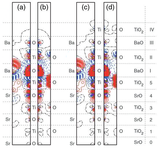 Difference electron charge density charts computed for STO/BTO (001) interfaces. (a) (110) cross-section for NBaTiO3 = 3. (b) (100) cross-section for NBaTiO3 = 3. (c) (110) cross-section for NBaTiO3 = 4. (d) (100) cross-section for NBaTiO3 = 4. Blue dashed, red solid, and black dash–dot isolines represent negative, positive, and zero values of difference charge density. Isodensity curves are plotted from −0.025 to +0.025e Å−3 using the increment of 0.0005e Å−3. Right-hand bar shows the atomic monolayer from which the atoms originated. Computations were carried out using the B3PW exchange-correlation functional. STO and BTO monolayers are enumerated starting from the slab center. Monolayers are enumerated one by one for STO (001) substrate and for augmented BTO (001) nano-film by employing Arabic or Roman characters [].