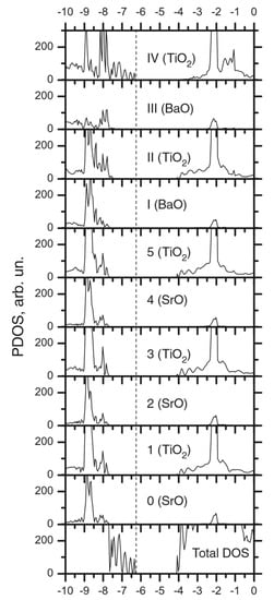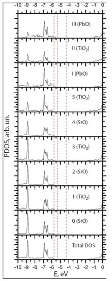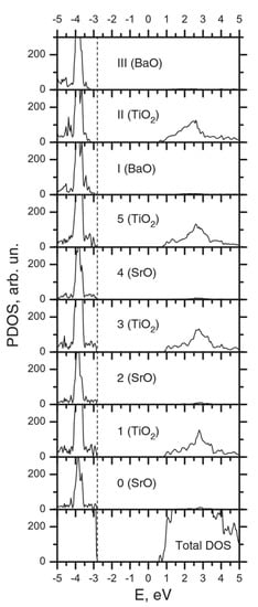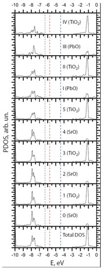 Our ab initio B3PW-computed DOS values, which were considered layer-by-layer on all orbitals of Sr, Pb, O, and Ti atoms of the three- and four-unit-cell (UC)-thick STO/PTO (001) interfaces, are depicted in Figure 11 and Figure 12. As with all bulk ABO3 perovskites, the top of the valence band for the STO/PTO (001) interface consists mainly of O2p orbitals, whereas the bottom of the CB for the STO/PTO (001) interfaces is mostly composed of Ti3d atomic orbitals.