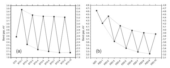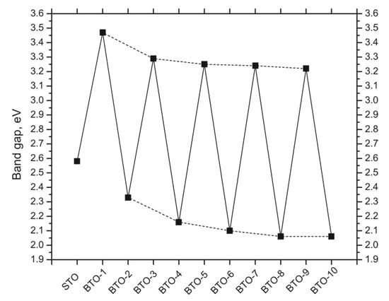 B3PW-simulated optical band gaps of STO/BTO (001) heterostructures (Table 5). The number of deposited BTO monolayers switches from 0 (TiO2-terminated STO eleven-layer (001) substrate) to 10. Dashed lines serve as a guide for the eyes [].