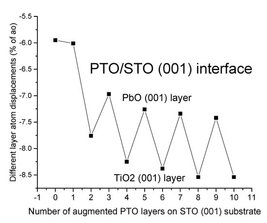 Next, we gradually and symmetrically augmented from one to ten alternating PbO and TiO2 layers (PbO_TiO2_PbO_TiO2_PbO_TiO2_PbO_TiO2_PbO_TiO2) on both sides of the SrTiO3 (001) substrate. So, the STO/PTO (001) interface in our ab initio computations contained an eleven-layer STO (001) substrate, which consisted of 28 atoms, and 10 PTO (001) layers, which consisted of 25 atoms that were symmetrically augmented on both sides on the (001) substrate (Figure 8). Thus, the largest atom number in the ab initio STO/PTO (001) interface computations was 78 atoms, with a unit cell formula equal to Sr5Pb10Ti16O47. It is worth noting that during the epitaxial PTO (001) film growth (Figure 8), lattice mismatch between the PTO and STO bulk lattice constants arose (Table 2). Therefore, in the first-principles B3PW simulations, we optimized the joint STO/PTO (001) interface lattice constant for the thickest computed STO/PTO (001) interface, which consisted of 31 layers and 78 atoms, in order to minimize the strain effect [,]. Our ab initio B3PW-computed STO/PTO (001) interface joint lattice constant is equal to 3.91 Å.