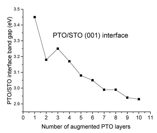 The first-principles B3PW-simulated band gap for the PbO-terminated PTO (001) film augmented on the STO (001) substrate, which contains one layer (x = 1), is 3.45 eV (Figure 13 and Figure 14). The PbO-terminated augmented PTO (001) film band gaps for systems that contain three, five, seven, and nine layers are 3.25 eV, 3.08 eV, 2.99 eV, and 2.94 eV (Figure 13 and Figure 14). The first-principles-simulated band gaps for the TiO2-terminated PTO (001) film, augmented on the STO (001) substrate (Figure 13 and Figure 14), which contains two, four, six, eight, and ten layers, are 3.18 eV, 3.17 eV, 3.05 eV, 2.99 eV, and 2.93 eV.