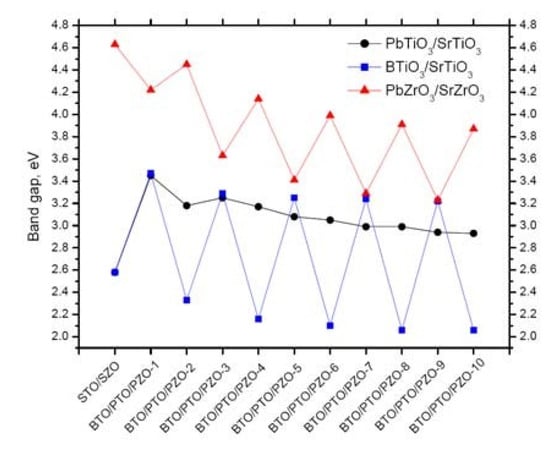 Ab initio computed optical band gaps for STO/PTO (001) interfaces, depending on the number of PTO (001) layers (x = 1–10), augmented on the TiO2-terminated STO (001) substrate. Ab initio computed band gaps for STO/BTO and SZO/PZO (001) heterostructures are mentioned for comparative purposes [].