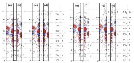 Difference electron charge density charts computed for STO/BTO and SZO/PZO (001) interfaces. (a) (110) cross-section for NBaTiO3 = 3. (b) (100) cross-section for NBaTiO3 = 3. (c) (110) cross-section for NBaTiO3 = 4. (d) (100) cross-section for NBaTiO3 = 4. (e) (110) cross-section for NPbZrO3 = 3. (f) (100) cross-section for NPbZrO3 = 3. (g) (110) cross-section for NPbZrO3 = 4. (h) (100) cross-section for NPbZrO3 = 4. Blued dashed, red solid, and black dash-dot isolines describe negative, positive, and zero values of the difference charge density. Isodensity curves are plotted from −0.025 to +0.025e Å−3 with an increase of 0.0005e Å−3. Right-side bar displays the atomic monolayers from which atoms originated [].