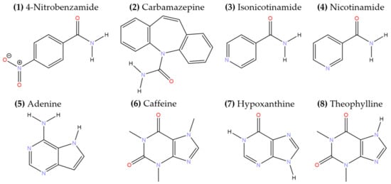 - Trask, A.V.; Motherwell, W.D.S.; Jones, W. Pharmaceutical Cocrystallization: Engineering a Remedy for Caffeine Hydration. Cryst. Growth Des. 2005, 5, 1013–1021. [Google Scholar] [CrossRef]