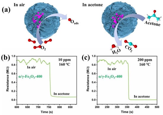 - Song, Z.; Chen, H.; Bao, S.; Xie, Z.; Kuang, Q.; Zheng, L. Nanosheet-assembled, hollowed-out hierarchical γ-Fe2O3 microrods for high-performance gas sensing. J. Mater. Chem. A 2020, 8, 3754–3762. [Google Scholar] [CrossRef]