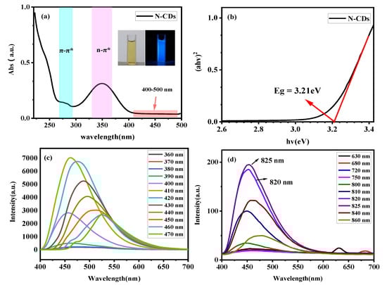 The optical properties of the DN-CDs were measured using UV-vis absorption and PL spectroscopy, as shown in Figure 1a. Typically, the absorption of carbon dots could be divided into two main regions: π—π* and n—π* transition [52]. The weak absorption peak at 241 nm was the π—π* transition of C=C, attributed to the absorption peak of the carbon atom in cyclic aromatic hydrocarbons [53]. The wide absorption peak at 350 nm indicated the n—π* transition of the nitrogen- or oxygen-containing functional groups on the surface of the DN-CDs, attributed to the doping with N atoms [54]. The bandgap energies were determined according to the Tauc plot (Equation (2)) as follows: