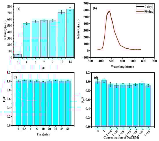 (a) The effect of pH on the UCPL intensity of DN-CDs in a range from 1 to 13. (b) The effect of storage time on PL intensity of DN-CDs after 90 days. (c) The effect of 60 min of UV irradiation on the UCPL intensity (F0 is the initial UCPL intensity and F is the UCPL intensity after under UV irradiation). (d) The effect of salt concentration on the UCPL intensity for DN-CDs at different concentrations of NaCl (‘F0’ is the PL intensity of a blank sample and ‘F’ is the intensity of the experimental sample).