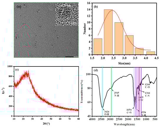 The morphological and surface properties of the DN-CDs were investigated by TEM, FT-IR, XRD and XPS; the results are shown in Figure 3 and Figure 4. DN-CDs were nearly spherical with a size distribution between 1.5 and 4.5 nm and the average particle size was about 2.4 nm (Figure 3a,b). Furthermore, the dynamic light scattering (DLS) results in Figure S3 showed that the dynamic diameter of the DN-CDs was about 2.7 nm, which was basically consistent with the TEM. Additionally, we also tested the DLS of DN-CDs in strong acidic and alkaline environments, and found that there was a slight aggregation phenomenon with strong acids, with average size of 3.7 nm. This was also consistent with the fluorescence and Zeta potential changes under strong acidic conditions in Section 3.2. Meanwhile, we found that the crystalline lattice fringe had a space of 0.21 nm, which corresponded to the (100) lattice of graphene in the inset in Figure 3a. Through the Zeta potential of the DN-CDs, it was suggested that the DN-CDs had a negative charge (Figure S3). This was attributed to the partial ionization of the hydroxyl or carboxyl groups in the DN-CDs, which caused the formation of oxygen negative ions. Figure 3c shows the XRD pattern of the DN-CDs with broad peaks at 2θ = 23.9°, indicating that the carbon atom in DN-CDs was amorphous. Additionally, this also could be verified in the Raman spectrum of N-CDs in Figure S4. This demonstrated that the fluorescence properties of DN-CDs were mainly determined by the surface groups of the carbon dots.