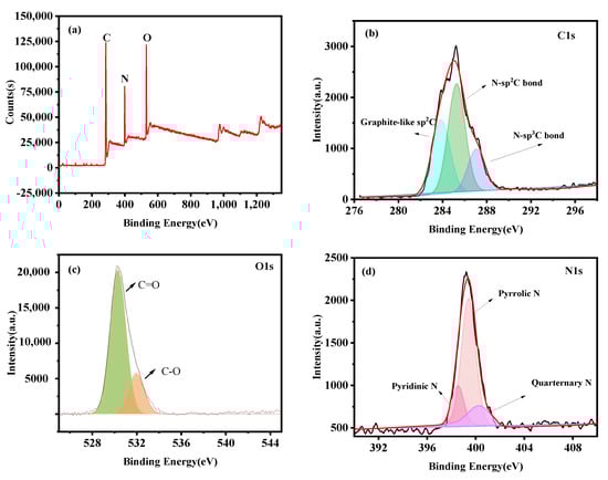 (a) The full-scan XPS spectra of the DN-CDs; (b) C1s spectra of the DN-CDs; (c) O1s spectra of the DN-CDs; (d) N1s spectra of the DN-CDs.