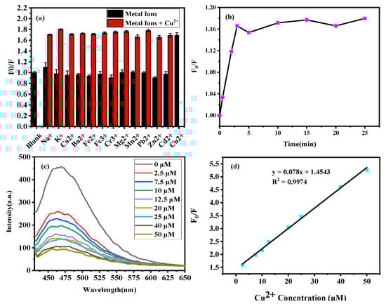 (a) The selectivity of DN-CDs to various metal ions: relative PL intensity of the DN-CDs (20 μg/mL) in the absence (black column) and presence (red column) of other metal ions (10 µM) (λex = 820 nm and λem = 450 nm); (b) the effect of reaction time on the quenching equilibrium of DN-CDs; (c) PL quenching efficiency of DN-CDs at different concentrations of Cu2+ ions (2.5–50 µM); (d) the linear relationship between PL intensity and Cu2+ ion concentration (F0 is the PL intensity in the absence of Cu2+ ions and F is in the presence of Cu2+ ions).