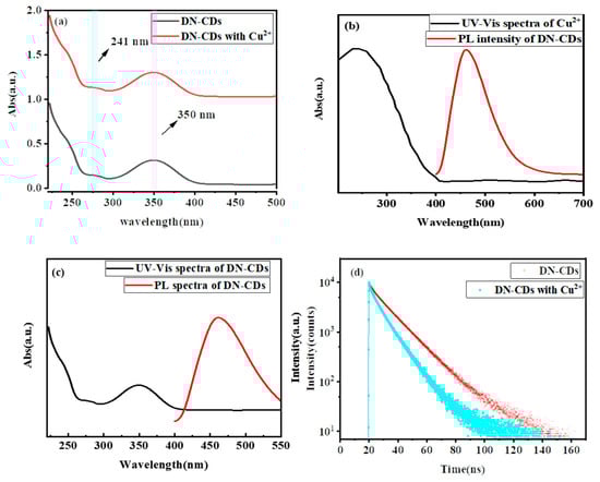 (a) The UV-Vis spectra of DN-CDs in the absence and presence of Cu2+ ions; (b) the comparison of the absorption spectra of Cu2+ ions and the emission spectra of DN-CDs at λex = 820 nm; (c) the UV-Vis spectra and emission spectra of DN-CDs at λex = 820 nm; (d) the fluorescence lifetime decay of DN-CDs in the absence and presence of Cu2+ ions (λex = 410 nm and λem = 450 nm).