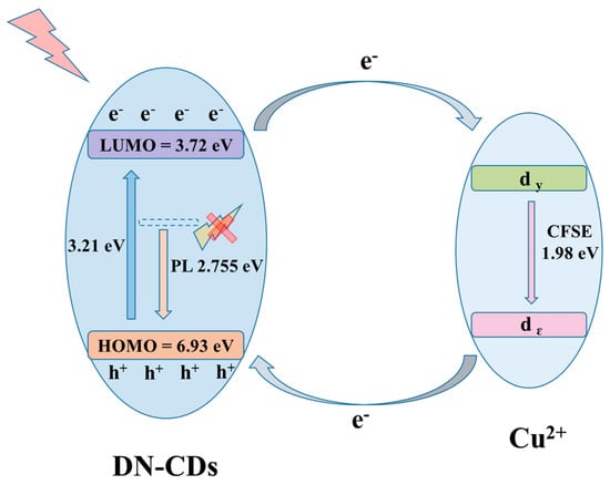 where ‘EOx’ and ‘ERed’ are the onset of oxidation and reduction potential of DN-CDs, respectively, and ‘Eg’ is the optical energy gap resulting from the UV-Vis adsorption. Additionally, the ‘ERed’ was −0.69 eV according to the CV plot (Figure S7). The ‘ELUMO’ was calculated to be −3.71 eV and ‘EHOMO’ was calculated to be −6.92 eV. Obviously, the band gap could overlap the crystal field stabilization energy of Cu2+ (1.98 eV) [64]. As illustrated in Figure 7, the excited electrons of the DN-CDs were prone to transfer to the d orbital of Cu2+ [65]. Thus, the fluorescence was suppressed and became a partially non-radiative progress.