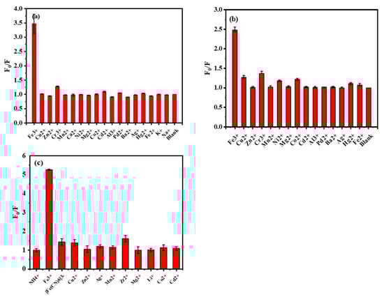 (a) The selectivity of N-CDs-1 to various metal ions at λex = 410 nm, λem = 510 nm and (b) λex = 808 nm, λem = 510 nm; (c) the selectivity of N-CDs-2 to various metal ions at λex = 380 nm, λem = 450 nm.
