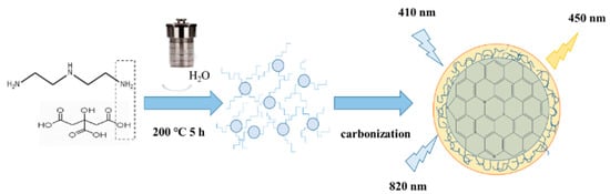 Carbon dots (CDs) are zero-dimensional carbon-based materials, mostly spherical nanoclusters with diameters of less than 10 nm, composed of amorphous or crystalline cores with sp2 hybrid carbon atoms [27]. Owing to their small size, high photostability, resistance to photobleaching, low toxicity, good water solubility, excellent biocompatibility and ease of surface functionalization, carbon dots have become the focus of fluorescent probe materials as well as in cell labeling, optical bioimaging, drug delivery, storage applications and photocatalysis [28]. Metal ions, such as Hg2+, Fe3+ and Cu2+, can effectively quench the fluorescence of carbon dots [29,30,31]. Carbon dots can be obtained by thermal decomposition [32], hydrothermal carbonization [33], microwave-assisted pyrolysis [34], electrochemical methods [35], etc. Hydrothermal carbonization refers to heating water and carbon-rich substances in a closed container to trigger the carbonization reaction. Citric acid is the most used carbon-rich substance, which is easy to condense and induce to form carbon rings, and is also has atoms that can be easily doped. Meanwhile, the surface of the formed carbon dots has rich functional groups, such as hydroxyl and carboxyl groups. The hydrothermal method is the most widely used method, which has the characteristics of good feasibility; cheap, diverse carbon sources; no toxicity; and environmental friendliness [36]. However, carbon dots without modification usually have a low quantum yield (QY) and poor stability, which affect their practical application [37,38]. Additionally, the origin of fluorescence in carbon dots has not yet been clarified. The fluorescence emission is primarily caused by the competition between the optical centers, surface states and traps [39]. Up-conversion fluorescence means that the shorter wavelengths of light are emitted through longer excitation wavelengths [40]. This fluorescence is usually caused by the multiphoton absorption effect. The fluorescence of carbon dots can be altered by controlling size and shape, modifying the edges of the surfaces and doping with heteroatoms, due to the edge effect, surface effect and quantum confinement effect (QCE) [41]. Doping different elements leads to better performance, such fluorescence improvement and shifting of the fluorescence spectra. Doping with different heteroatoms can change the electronic properties and excite special optical properties through the passivation of the surface states or the introduction of defects [42,43]. Salehtabar et al. [44] prepared photo-luminescent, water-soluble, nitrogen-doped, highly fluorescent carbon dots based on the gum tragacanth polysaccharide and triethylenetetramine (TETA). Therefore, it is a better way to synthetize fluorescent probe materials based on carbon dots with a higher sensitivity, higher selectivity, high quantum yield and unique fluorescence performance.