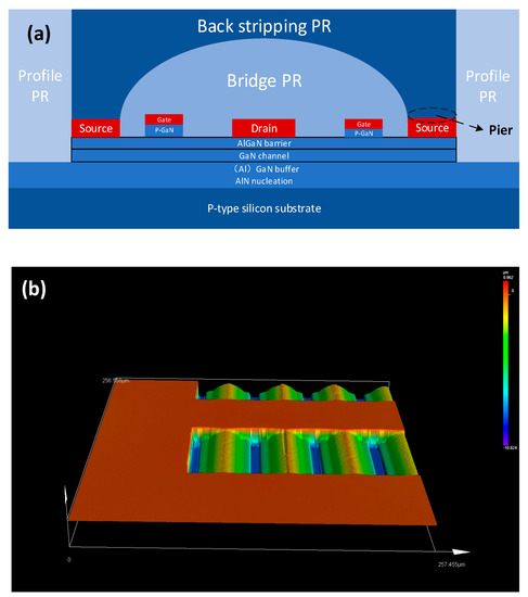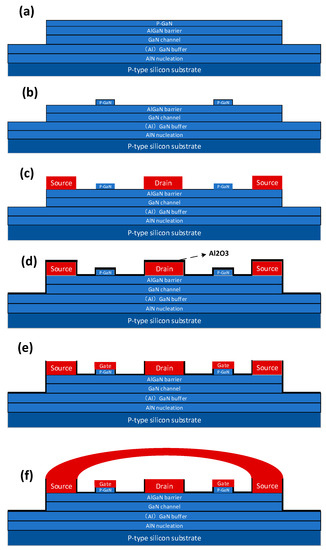Gallium nitride- (GaN) based high-electron-mobility transistors (HEMT) are promising candidates for high-power applications due to their superior material and device characteristics [1,2]. Two-dimensional electron gas (2DEG) is created and limited at the interface between AlGaN/GaN by the piezoelectric effect of the GaN/AlGaN heterojunction and the spontaneous polarization effect. Based on the conventional structure of AlGaN/GaN-channeled electrons, it allows only the construction of depletion-mode normally-on devices. D-mode devices must import a continuous negative gate voltage to realize device turn-off; hence, they need extra-complicated gate-driver circuitry. In order to achieve normally-off GaN HEMT, different technologies have been proposed, such as cascode configuration combining Si-based normally-off MOSFET and GaN-based normally-on HEMT, fluorine-ion-implantation gate HEMT, gate-recessed MIS (metal–insulator–semiconductor)-HEMT, and p-GaN gated HEMT. Among the various GaN devices, p-GaN gate HEMT have the advantage of a stable threshold voltage and high repeatability of the process and have been commercially accepted and adopted [3]. With the development of the high-current p-GaN gate HEMT, the source-connection technology has been utilized to realize the large gate-width device [4]. Several common interconnection methods are adopted in multi-finger devices: the dielectric-isolation connection, back-hole connection using Through Silicon Via (TSV), and air-bridge connection. The air-bridge source-connection is an effective method to connect the source in the large gate-width device with a multi-finger structure [5]. The source-connected air-bridge field plate (AFP), which jumps from the source over the gate and lands between the gate and drain, has been fabricated. Compared to HEMT with a conventional field plate, this AFP structure can result in a three-times-higher improvement in forward-blocking voltage, attain 375 V, 37% lower Ron,sp, and drain leakage current lower by one order of magnitude. Dora Y shows that slant-field-plate technology has been fabricated and proven to be very effective; the slant-field plate is self-aligned with the gate in a single-process step and is shown to support a breakdown voltage up to 1900 V [6]. The Coffie R model shows that transition angles of less than 30° (measured from the surface) can result in significant improvements in electric field management [7].