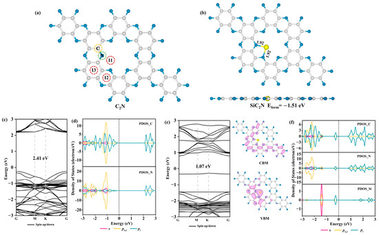 Then, the band structures and partial density of states (PDOS) plots were investigated with the HSE06 functional in Figure 1c–f to obtain accurate electronic characteristics of intrinsic C2N and SiC2N. Firstly, as shown in Figure 1c,d, the pristine C2N exhibits a semiconductor feature with a direct band gap of ~2.41 eV, which is quite consistent with previous studies [46]. As shown in Figure 1e, after Si doping, the band gap of SiC2N considerably decreases to 1.07 eV, which is conducive to electron transmission. Additionally, the Si doping yields a new state on the VBM, which is mainly localized around the Si atom. More notably, from the PDOS plot of SiC2N, we can observe that the VBM mainly consists of active pz electrons, which ensure high activity of SiC2N for gas adsorption. In addition, strong hybridization can be observed between Si and N atoms, signing strong covalent characters. Herein, the band structures of pure C2N and SiC2N were also calculated with the PBE functional, as displayed in Figure S3a,b. Additionally, the obtained band gap values for C2N and SiC2N with the PBE functional are 1.65 and 0.60 eV, respectively. To sum up, Si doping can effectively regulate the electronic structure of C2N, which will be beneficial for electron transmission and gas adsorption.