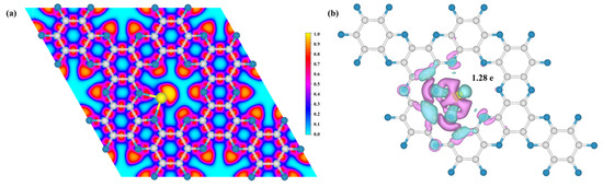 The electron localization function (ELF) map of SiC2N is presented in Figure 2a. The ELF map has been deemed a useful tool to directly ascertain the bonding nature and the degree of electron localization [47,48]. In general, the region with an ELF value > 0.5 signs covalent interaction and high electron localization [49]. Firstly, topographical analysis of ELF manifests that the formed Si-N exhibits a covalent feather. In addition, the highly localized electrons are located on the Si atom, which is susceptible to interaction with the incoming gas molecules. In addition, the charge density difference (CDD) plot of SiC2N between the Si atom and C2N was also analyzed in Figure 2b, from which we can see remarkable charge transfer between the Si atom and the substrate. Additionally, the Bader charge result demonstrates that the Si atom donates 1.28 e to the C2N.