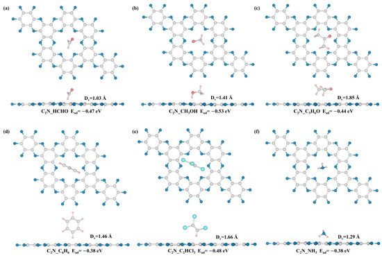 The optimal binding configurations were filtered out and depicted in Figure 3, and the corresponding adsorption energies were listed in Table 1. As displayed in Figure 3, the HCHO, C6H6, and C2HCl3 molecules tend to adsorb on the C2N sheet in a vertical orientation, in which their C-H bonds point toward the large hole of C2N. The vertical distances (named as Dv) between the HCHO, C6H6, and C2HCl3 molecules and the substrate are 1.03, 1.46, and 1.66 Å, respectively, while the CH3OH and C3H6O molecules prefer to lie flat on the C2N surface with vertical distances of 1.41 and 1.85 Å, respectively. When it comes to the NH3 molecule, the NH3 is adsorbed on the surface of C2N with its two H atoms downwards; the Dv between NH3 and C2N is 1.29 Å. Notably, scrutinizing the binding configurations of C2N_gas systems, there are no obvious chemical bonds between them, which portends weak interaction. Moreover, the adsorption energy of −0.50 eV is always used to distinguish physical and chemical adsorption [52]. As summarized in Table 1, the Ead of C2N for HCHO, CH3OH, C3H6O, C6H6, C2HCl3, and NH3 molecules are −0.47, −0.53, −0.44, −0.38, −0.48, and −0.38 eV, respectively, demonstrating physisorption or weak chemisorption. Their relatively weak interaction ascribes to the van der Waals affinity of π-electrons in C2N toward VOCs (or NH3). Additionally, it can be seen that the adsorption energies of pure C2N toward these gases are at a comparable level, indicating poor selectivity.