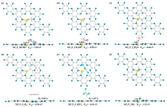 The optimal binding configurations of (a) SiC2N_HCHO; (b) SiC2N_CH3OH; (c) SiC2N_C3H6O; (d) SiC2N_C6H6; (e) SiC2N_C2HCl3, and (f) SiC2N_NH3. Bonds are in Å. (Silvery: C atom, Blue: N atom, Yellow: Si atom, Red: O atom, Cyan: Cl atom, Pink: H atom).