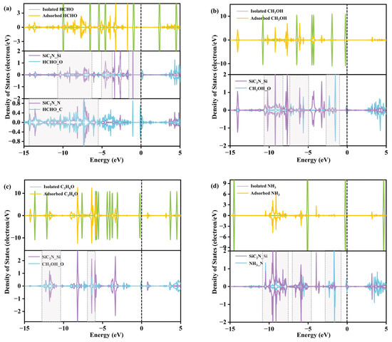 The density of states of gases before and after adsorption, and the partial density of states of working Si (or N) atom in SiC2N and the O (or N) in gases for (a) SiC2N_HCHO, (b) SiC2N_CH3OH, (c) SiC2N_C3H6O, and (d) SiC2N_NH3 systems.