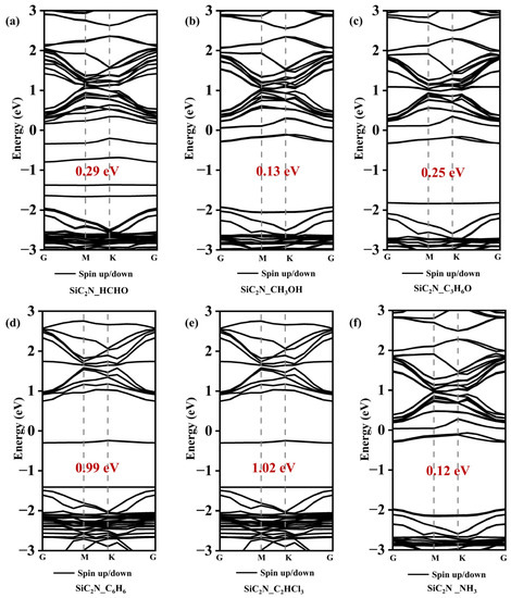 Band structures of (a) SiC2N_HCHO, (b) SiC2N_CH3OH, (c) SiC2N_C3H6O, (d) SiC2N_C6H6, (e) SiC2N_C2HCl3, and (f) SiC2N_NH3 systems calculated by the HSE06 functional.