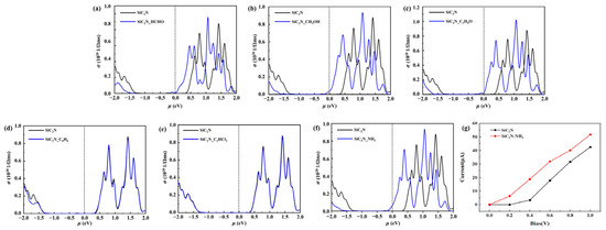 where the and donate the electrical conductance of SiC2N_gas and SiC2N systems, respectively. Additionally, according to the relationship between the σ and Eg in Equation (3), the S can be written as follows: