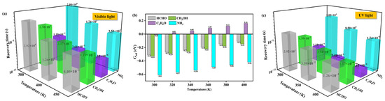 where the G(SiC2N_gas) and G(SiC2N) donated the Gibbs free energies of SiC2N_gas and SiC2N, respectively. Additionally, the G(gas) was the Gibbs free energies of isolated VOCs and NH3. It can be seen that only the NH3 exhibits a relatively large ∆Gad of −0.43~−0.61 eV at 300~400 K. The ∆Gad for O-containing VOCs on SiC2N is quite small, indicating that the entropy effect involving the temperature is conducive to the desorption of gases. In addition, according to previous reports, the recovery time can be further shortened by exposure to UV light (ω = 1016/s) due to the elimination of the desorption barrier [69,70]. Additionally, UV light has been widely used to reduce recovery time. Aasi and coworkers have reported that the desorption of indole from Pd-decorated MoS2 needs a recovery time of 1.28 × 105 s, whereas, under UV light, the recovery time can greatly decrease to 12.8 s. Herein, the recovery time of SiC2N_gas systems under UV light at 300, 350, and 400 K is shown in Figure 9c. It can be seen that, under exposure to UV light, the SiC2N_HCHO, SiC2N_CH3OH, and SiC2N_C3H6O possess short recovery times of 29.2, 0.13, and 1.19 × 10−6 s, respectively, at room temperature. Even for the SiC2N_NH3 system, when using UV light, the recovery time can be effectively shortened to 26.2 s at 350 K. In a word, the apparent changes in conductivity and acceptable recovery time offer significant advantages for SiC2N as a resistive-type sensor in the detection of O-containing VOCs and NH3.