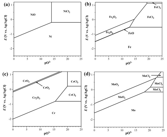 Calculated E-pO2− diagram at 500 °C for (a) Ni, (b) Fe, (c) Cr, and (d) Mo.