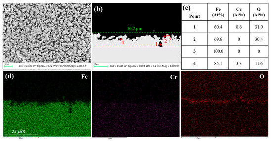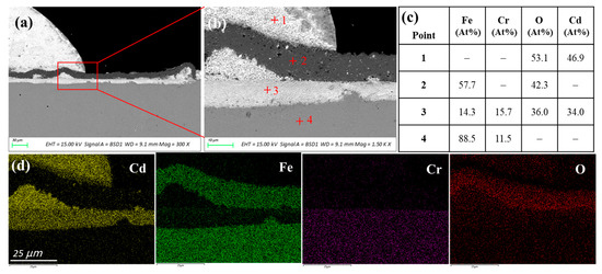 (a,b) are SEM cross-sectional images of AISI 316L after 120 h corrosion in liquid Cd; (c) is the corresponding EDS analysis results of points in image (b); and (d) is EDS elemental mapping of image (b).