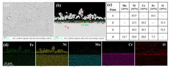 Haynes C276 is a nickel-based superalloy with more than 50 wt% nickel, 15–17 wt% molybdenum, and 14.5–16.5 wt% chromium. Haynes C276 exhibited a unique corrosion morphology compared to AISI 316L and Inconel 600, as shown in Figure 6. The SEM surface image demonstrated massive precipitates on the alloy surface. Examination of the cross section revealed a uniform oxide layer underneath these precipitates. Visually, there were still some light-contrast alloy matrices that remained in the oxide layer. The EDS elemental mapping revealed that the oxide layer was enriched in Cr and O with presence of some Ni. The EDS quantitative analysis of points 2 and 3 exhibited an atomic ratio of Cr/O that was very close to Cr2O3. The detected 10–13 at% of Ni in the thin oxide layer was likely associated with the residual nickel matrix. The top precipitates were composed of more than 80 at% Ni and about 12–13 at% Fe. No molybdenum was detected either in the top precipitates or in the thin oxide layer. This suggests that Mo in the near-surface corroded region must be readily dissolved in the molten salt. However, Mo is more prone to chlorination than that of Ni and Fe. Thus, the depletion of Mo in the nickel matrix suggests that Mo was oxidized to volatile Mo oxides. In fact, the formation of molybdenum oxides is thermodynamically favorable in salt with concentrations of O2− ions as low as that for the formation of chromium oxides (see Figure 2). Among MoO2 and MoO3, MoO3 is more volatile at evaluated temperatures. The melting temperature of MoO3 is 795 °C, indicating a relatively high vapor pressure. Thus, it is speculated that Mo in the Haynes C276 was corroded through the formation of volatile MoO3. As Cr was also preferentially oxidized as Cr2O3, remaining Ni and Fe were alloyed to form Ni-Fe precipitates in the near-surface corroded region. This suggests that the significant amount of Mo addition in Haynes C276 might be detrimental, as the evaporation of volatile Mo oxides could break down the chromium oxide layer and increase the dissolution rate of the alloy matrix underneath. Such effects have been previously reported by Shankar et al. [17], who found that the corrosion rate of Inconel 625 (Ni-18Cr-4Fe-11Mo) was remarkably higher than Inconel 600 (Ni-17Cr-10Fe-1Mn) in molten LiCl-KCl eutectic due to the presence of Mo in Inconel 625.