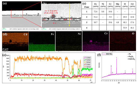 Figure 7 shows the cross-sectional SEM images and the corresponding EDS and XRD analysis results of AISI 316L stainless steel after 120 h of exposure in liquid cadmium at 500 °C. The bright contrast in the backscattered electron image (Figure 7a,b) is the heavy metal cadmium that adhered on the steel surface. At the interface of 316L steel and cadmium, a uniform oxide layer with a thickness of about 6–9 µm was formed. Obviously, the protectiveness of this oxide layer was limited as the bright cadmium phase was embedded into the dark oxide layer, indicating the penetration of cadmium. Even for the dark oxide phase, the EDS quantitative analysis of point 2 and point 3 exhibited 12–18 at% of Cd. The XRD analysis of the corroded AISI 316L exhibited diffraction patterns associated with Fe2O3 and CdCrO4 compounds (see Figure 7e). The phase equilibria for the system of CdO-Cr2O3-O2 was previously determined by Muller et al. [32]. In their phase diagrams, the stability domains for oxides, including α-CdCrO4, β-CdCrO4, CdCr2O4, and Cd2CrO5 as the functions of temperature and oxygen pressure, were well defined. At our experimental conditions, i.e., 500 °C and very low oxygen pressure, only Cr2O3 and α-CdCrO4 were thermodynamically stable. This is very consistent with our results in which CdCrO4 corrosion product was identified from the XRD analysis. The Cr2O3 was not identified from the XRD pattern, likely due to the amorphous feature of Cr2O3 products. In comparison, the oxide layers formed on AISI 316L in liquid lead bismuth eutectic under argon atmosphere typically manifest a dual-layer structure [33]. The outer oxide layer is mainly magnetite (Fe3O3) with the formation of plumboferrite (e.g., PbFe12O19 or PbFe6O10) sometimes at the outmost part. The inner oxide layer is composed of spinel Fe(Fe1−x, Crx)2O4 and non-oxidized Ni phase. Such a double oxide layer can act as a barrier to prevent the penetration of Pb and Bi into the steel matrix. However, in liquid cadmium conditions, Cd can permeate through the oxide layer by forming CdCrO4. As shown in Figure 7b, the penetration of Cd into the steel matrix up to a depth of about 11 µm was also observed underneath the oxide layer. This is very similar to the typical morphology of bismuth penetration into the austenitic stainless steels in liquid lead bismuth eutectic, which is caused by depletion of the high solubility of Ni in the near-surface region [34,35]. The selective depletion of Ni causes the transition from the austenitic phase to the ferrite phase in the near-surface region as Ni is a strong austenitic stabilization element. As a reminder, this phenomenon only occurs in liquid lead bismuth eutectic with depleted oxygen concentrations under a Ar-H2 or Ar-H2-H2O atmosphere. Under such conditions, there are no oxides, or only a porous oxide layer is formed on the steel surface, which allows the penetration of Pb and Bi into the steel matrix. However, Figure 7b shows that Cd can penetrate into the AISI 316L steel matrix, even under an argon atmosphere where oxygen is typically saturated in liquid Cd. This could be attributed to the formation of CdCrO4 in the oxide layer. The depletion of Ni in the Cd penetration zone underneath the oxide layer was also identified from the EDS line scan (see Figure 7d). As we mentioned, the solubility of Ni in liquid Cd at 500 °C is more than 10 at%. Ni was also not detected in the oxide layer because the formation of NiO is also thermodynamically less favorable than that of Cd, Fe, and Cr. Thus, Ni in the steel matrix must be readily dissolved in the liquid cadmium. This will lead to the transition of austenitic phase to ferritic phase as previously acknowledged in the field of liquid lead bismuth corrosion [34,35]. Then, liquid cadmium will penetrate into the Ni depleted region through the voids left by Ni and the grain boundaries of the fragmentized ferritic grains. In addition, sulfur oxide particles were observed outside the oxide layer surface. This indicates that sulfur impurities in the stainless steel were transferred to the liquid cadmium phase, likely through the replacement reactions between Cd or CdO with sulfide inclusions in the stainless steel such as FeS or MnS.