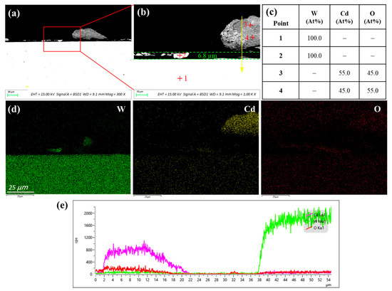 (a,b) are SEM cross-sectional images pure W after 120 h of corrosion in liquid Cd; (c) is the corresponding EDS analysis results of points in image (b); (d) is the EDS elemental mapping of image (b); and (e) is EDS scan along the yellow line in image (b).