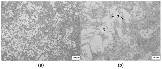 Initial microstructures of the as-hot-rolled Ti-2Al-9.2Mo-2Fe alloy: (a) low and (b) high magnification.