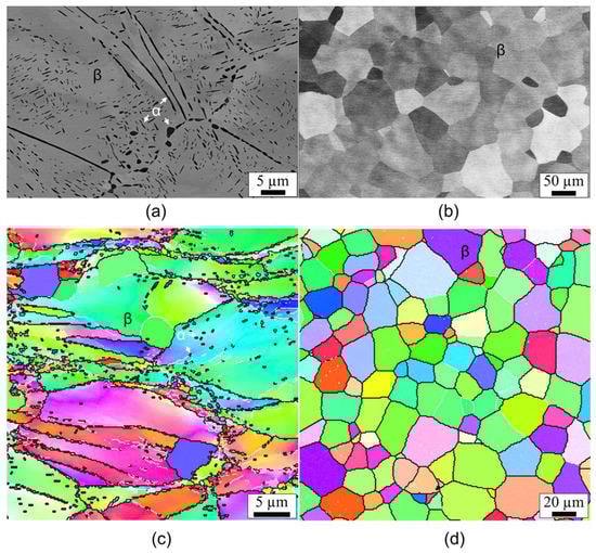 EBSD observations revealed that the β grains in the α/β solution-treated sample still contained in-grain orientation gradients and a considerable amount of low-angle grain boundaries, as shown in Figure 2c. Only a few β grains are free of orientation gradients, which means that they are newly recrystallized grains. The β grains in the β solution-treated sample were nearly free of orientation gradients and surrounded by high-angle grain boundaries, indicating the occurrence of a complete recrystallization (Figure 2d). The equiaxed β grains had a grain size of ~35 µm.