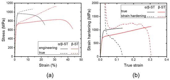 Figure 3 shows the tensile stress–strain curves and strain-hardening behaviors of the solution-treated samples. The average values and standard deviations of tensile properties are summarized in Table 1. The alloy that was solution-treated below the transus temperature (α/β-ST) has a moderate strength of about 958 ± 14 MPa in UTS and 904 ± 12 Mpa in YS, and an elongation of approximately 20%. However, the alloy that was solution-treated above the transus temperature (β-ST) resulted in a slightly decreased strength of about 834 ± 12 Mpa and YS/UTS ratio of ~0.83 with an excellent ductility over 40% of elongation, as shown in Figure 3a.