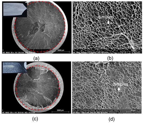 Fracture surface observations of the tensile-tested alloy samples: (a,b) α/β-ST and (c,d) β-ST. Red dotted lines indicate the final diameters of the sample after tensile testing.