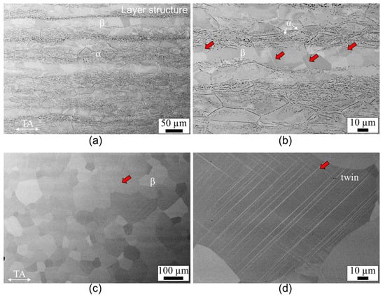 BSE maps of the 4% deformed samples: (a,b) α/β-ST and (c,d) β-ST. TA pertains to the tensile axis. Red arrows indicate the formation of twinning.