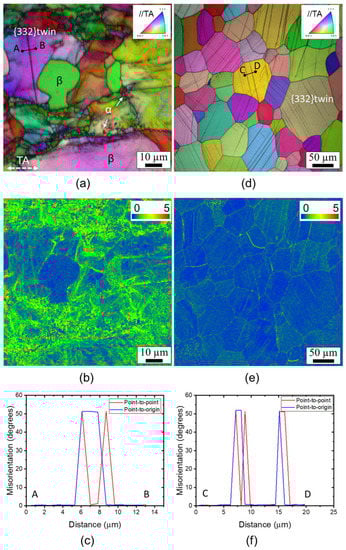 EBSD IPF + image quality (IQ), kernel average misorientation (KAM), and misorientation line analyses of the 4% deformed samples: (a–c) α/β-ST and (d–f) β-ST. TA pertains to the tensile axis.