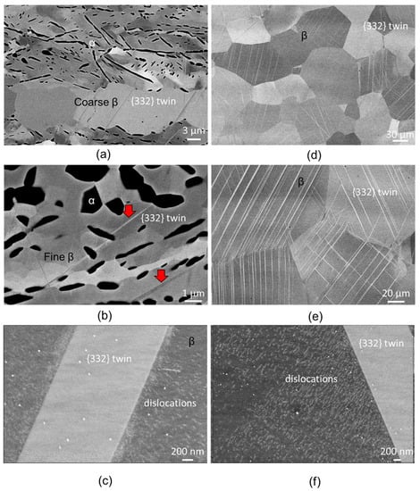 ECC images showing the deformation structures and substructures of the 4% deformed samples: (a–c) α/β-ST and (d–f) β-ST. Red arrows indicate the formation of twinning.