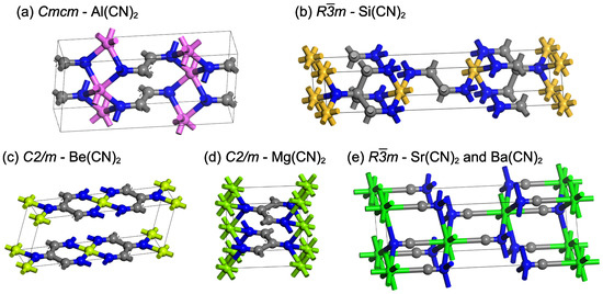 These compound variants can be applied to systems other than alkaline-earth elements. The bonding nature between C and N in such systems may alter the structure, properties, and stability even when the formula is the same. The technique of structural simulation is the most popular and useful way to investigate valuable components made of well-known elements. Some reports of amorphous materials with various C/N ratios have been developed (e.g., Matsunaga et al. [5]). However, there have been relatively few studies on compounds in regard to stoichiometry, such as , where A is not a common valent element (e.g., alkaline-earth metal and zinc). Therefore, it is worthwhile to investigate the potential structures of these compounds using computational simulations.