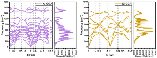 First-principles calculations based on DFT [17,18] were implemented in the Cambridge Sequential Total Energy Package (CASTEP) [19,20]. For the exchange-correlation function, a generalized gradient approximation (GGA) in the form of the Perdew–Burke–Ernzerhof (PBE) [21] and the local density approximation (LDA) [22,23] were considered using the on-the-fly-generated ultrasoft pseudopotential method [24]. The plane-wave kinetic-energy cutoff was set to 570 eV and, to achieve structural optimization, the k-points separation was set to 0.07 Å for all calculations in the Brillouin zone, with the Monkhorst–Pack method applied for the point distribution [25]. Since the GGA and LDA underestimate the energy bandgap [21], we used the screened hybrid functional of Heyd, Scuseria, and Ernzerhof (HSE06) [26] as a reference to calculate and along with an on-the-fly-generated norm-conserving pseudopotential [27]. The plane-wave kinetic-energy cutoff was set to 990.0 eV for HSE06. The minimization algorithm we used was the Broyden–Fletcher–Goldfarb–Shanno (BFGS) method [28] with convergence tolerances set to eV/atom for energy, 0.01 eV/Å for maximum force, 0.02 GPa for maximum stress, and Å for maximum displacement. The phonon spectra were calculated by using the finite-displacement method.