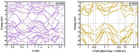 According to the band structure shown in Figure 4, has metallic properties similar to the structure of and , which is thought to be caused by the conjugated carbon chain structure. On the other hand, has an indirect bandgap of 3.093 eV with the GGA functional (see Table S1 and Figure S1: 3.048 and 4.551 eV for the LDA and HSE06 functionals, respectively). Compared with 4.143 eV for and 4.122 eV for , the bandgap of is smaller. However, it is larger than the 2.01 eV of 6H- [35]. Since the experimental bandgap of 6H- is 3.02 eV [36] and the calculated bandgap using GGA functional is an underestimate, we assume that is a wide-bandgap semiconductor.
