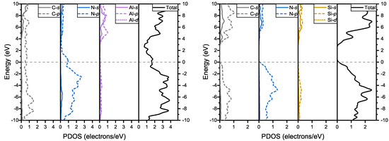 The structure of is shown in Figure 1a; the coordination numbers of aluminum, nitrogen, and carbon are 6, 4, and 3, respectively. The bond angles ∠CCC and ∠CCN are both near to 120° (Table 1), indicating that the carbon in is hybridized and conjugated. This carbon chain structure is similar to the previously structure of and in (Figure 1c,d) [4].
