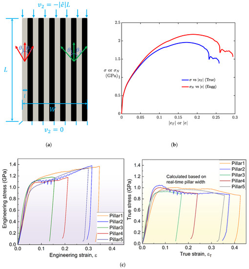 The initial configuration of NMLs, as shown in Figure 2a, is such that there are 12 alternating layers of Cu and Nb. Each layer has a thickness of nm with the width of the composite being nm. The aspect ratio of the NML composite is 1:2, with an undeformed height of the sample being nm. The nominal compression loading rate is , and at any time t, the nominal compressive strain is . The corresponding true compressive strain is denoted as . The average true compressive stress is denoted by , while the average nominal compressive stress is denoted by . Plastically unconstrained boundary conditions are applied to all four (external) boundaries of the domain, for all results shown in this work. Quasi-static force equilibrium is solved for all simulations reported here.