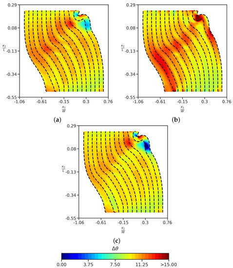 Rotation field of slip vectors ( in degrees) in the current configuration w.r.t. their initial orientation at for (a) layer parallel slip vector, (b) oriented slip vector, (c) oriented slip vector. The dashed black lines in all Figures show the deformed lines of the interface between the Cu and Nb layers in the current configuration.