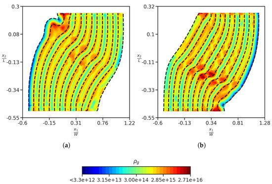 Figure 6. Field plot of GND density (a) after flipping the order of Cu and Nb layers at , (b) after removal of oriented slip plane, and at , but the order of metallic layers is the same as shown in Figure 2a. The dashed black lines in both Figures show the deformed lines of the interface between the Cu and Nb layers in the current configuration. - Removal of inclined slip system, and just considering layer parallel slip system and inclined slip system, resulted in the orientation of the band as shown in Figure 6b.