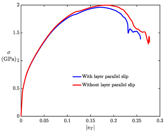 Figure 7. True stress-strain curve with/without accounting for layer-parallel slip system.