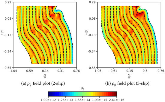 We further compare the field plots of GND density () with/without the layer parallel slip system as shown in Figure 8 at strain. It is evident that the shape of the kink band and the GND density are similar in the two cases. This is a departure from the results reported in the experimental work by Zhang et al. [8], where it was reported that the layer-parallel slip system is responsible for the evolution of the shape of the kink band. We leave a more realistic investigation of the effects of layer parallel slip systems for future work, where we will be modeling the 3-D geometry of NML and considering all the slip systems in Cu (FCC) and Nb (BCC).